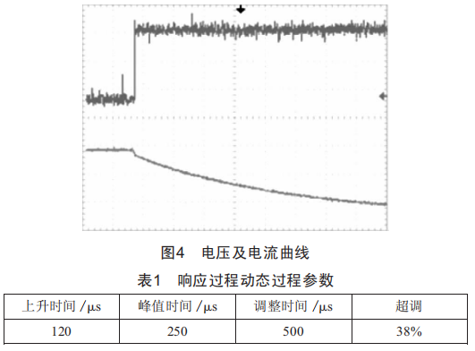 由表1數(shù)據(jù)可知 ,雖然超級(jí)電容輸出電流超調(diào)較大 ,但是能夠在150 μ.內(nèi)迅速達(dá)到穩(wěn)定值。從上述分析可知 ,在對(duì)于電源響應(yīng)性能要求高的場(chǎng)合 , 以超級(jí)電容器作為儲(chǔ)能單元能夠提高系統(tǒng)的電流響應(yīng)速度 ,縮短系統(tǒng)達(dá)到穩(wěn)定的時(shí)間。