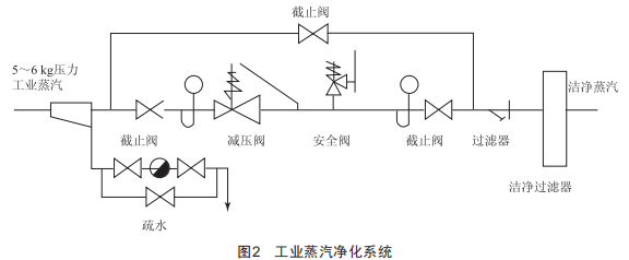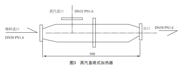 為使?jié){料上銀后盡快升溫至100℃(100℃為水的汽化溫度),縮短漿料加熱階段的時(shí)間,延長蒸發(fā)(干燥)階段,可在漿料輸送主管道末端增加工業(yè)蒸汽凈化系統(tǒng)(圖2)及蒸汽直噴式加熱器(圖3),使?jié){料預(yù)熱升溫至50~60℃,該溫度可使?jié){料升溫達(dá)到預(yù)糊化狀態(tài),同時(shí)不影響成膜效果。