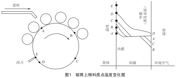 漿料在銀筒上的干燥過程如圖1所示,加熱階段:漿料通過管道輸送到銀筒表面,物料開始受熱成膜,水分蒸發(fā)較少:蒸發(fā)(干燥)階段:物料均勻成膜后,物料受熱熟化,水分開始大量蒸發(fā)汽化:完成階段:通過控制相應(yīng)參數(shù),使物料最終達(dá)到所需含水量,由刮刀刮下。物料溫度隨著在銀筒上轉(zhuǎn)動(dòng)而不斷變化,其中物料貼近銀筒一側(cè)的溫度不斷升高,使得水分不斷外移,物料外側(cè)與內(nèi)側(cè)的溫差卻從大逐漸變小,直至刮刀位置(E點(diǎn))物料內(nèi)側(cè)、外側(cè)與銀筒筒壁溫度幾乎一致。
