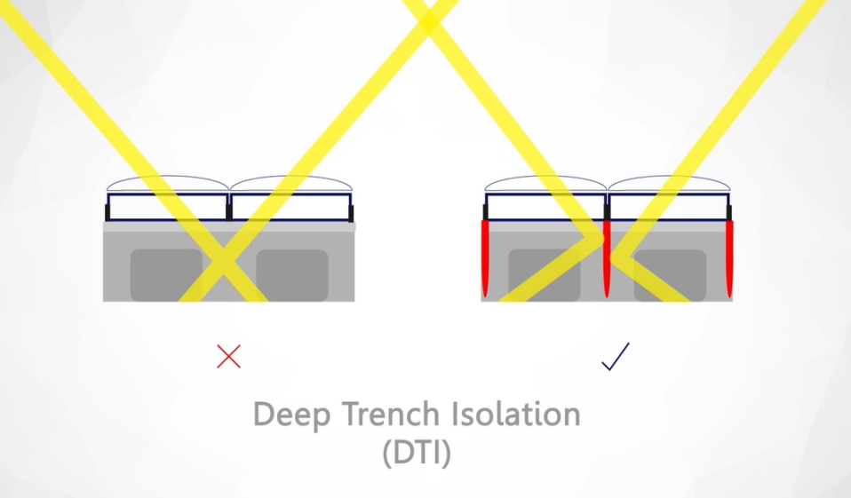 3)DTI:通過在硅片內的像素之間設置隔離來降低串擾,以獲得更好的主光角(CRA)的容忍度。