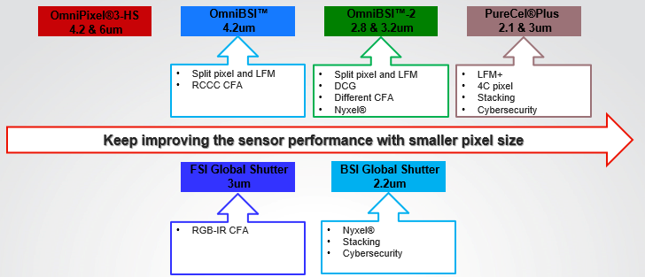 為解決該痛點,豪威不斷革新車載圖像傳感器技術,走過了OmniPixel®3-HS、OmniBSI?、OmniBSI?-2、PureCel®Plus四代工藝,像素由原來的4.2um發(fā)展到了2.1um的同時,大幅提升了Pixel性能,增加了更多功能。