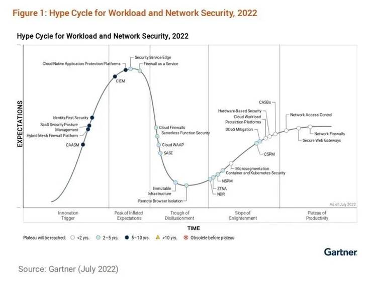 其中,Gartner認為網(wǎng)絡(luò)防火墻技術(shù)的發(fā)展階段從2021年的“穩(wěn)步復(fù)蘇區(qū)”(Slope of Enlightenment)進入了“穩(wěn)定生產(chǎn)成熟區(qū)”(Plateau of Productivity)。隨著云防火墻、FWaaS、云原生防火墻等新興“邊界安全”防護形式的加入,整個市場正朝向多元化的方向發(fā)展。而混合Mesh 防火墻平臺則正處于“技術(shù)萌芽區(qū)”(Innovation Trigger),其意義在于可以通過將網(wǎng)絡(luò)防火墻控制擴展到多個執(zhí)行點(包括 FWaaS 、云防火墻等)來實現(xiàn)混合環(huán)境的統(tǒng)一安全,從而使安全團隊能夠擴展現(xiàn)有的基于防火墻的安全策略以支持其他團隊(例如云、DevOps 團隊等)的統(tǒng)一運維,并與 XDR、CNAPP、SASE 和 CWPP 等其他技術(shù)集成,進而提高安全的整體預(yù)見性和控制力。