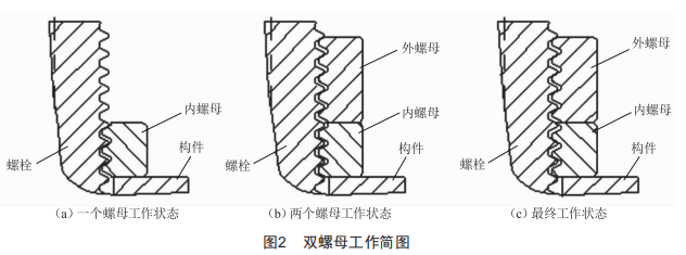 當擰上并逐步擰緊第二個螺母(即雙螺母的外螺母),外螺母螺紋的上部與螺栓螺紋的下部接觸并有相互頂力F2存在,而這時,外螺母對內(nèi)螺母同樣存在相互頂力F2,頂力F2使內(nèi)螺母螺紋的上部與螺栓螺紋的下部接觸頂力降低為F1-F2:隨著外螺母的繼續(xù)擰緊,外螺母與螺栓相互頂力F2增大,當F2=F1時,內(nèi)螺母螺紋的上部與螺栓螺紋的下部接觸頂力為零:當F2>F1時,內(nèi)螺母螺紋與螺栓螺紋將不會接觸,如圖2(b)所示。