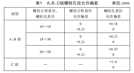 文獻[1]中規(guī)定A、B級螺栓孔應具有H12的精度,A、B、C級螺栓孔徑允許偏差要求如表1所示。