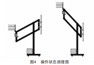 平行四邊形抬臂伸縮機(jī)構(gòu)由左平行四邊形抬臂伸縮機(jī)構(gòu)與右平行四邊形抬臂伸縮機(jī)構(gòu)組成,分別分布在底盤立桿的對立兩側(cè),每個(gè)平行四邊形抬臂伸縮機(jī)構(gòu)由兩根長桿和兩根短桿構(gòu)成,每側(cè)的兩根長桿通過活動關(guān)節(jié)安裝在底盤立桿上。這種連接方式可使長桿相對底盤立桿任意滑動,可以改變長桿與立桿之間的角度,同時(shí)也能改變平行四邊形相距地面的高度。