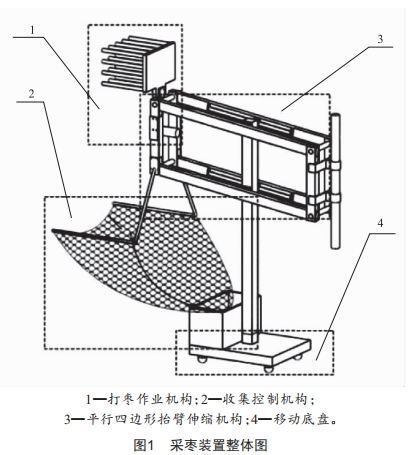 本研究設(shè)計(jì)了一款基于平行四邊形抬臂伸縮機(jī)構(gòu)的采棗裝置,在一定程度上可降低人工成本,提高工作效率。該裝置采用較高頻率的動作震動樹枝,模擬了人工利用工具反復(fù)敲打樹枝的動作來采摘棗子,可以減輕操作者的勞動強(qiáng)度,使其能夠長時(shí)間進(jìn)行采摘作業(yè),大大提高了采摘效率。該裝置對果園場地要求不高,能適用于我國任何類型的果園,應(yīng)用范圍廣。