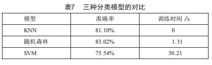 表7所示為三種分類模型的對比,其中KNN模型的K值為7,隨機森林含有30個決策樹,SVM的核函數(shù)是RBF核函數(shù)。由表7可知,三種模型中,隨機森林模型有著最高的預測準確率,消耗的訓練時間也較短,因此本文中的最佳模型是隨機森林模型。