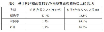 表6是基于RBF核函數(shù)的SVM模型的詳細實驗結果,由表6可知,SVM模型和上述KNN模型、隨機森林模型的情況類似,即負類數(shù)據的預測表現(xiàn)優(yōu)于正類數(shù)據的預測表現(xiàn)。這同樣是由于數(shù)據集數(shù)據分布不均衡導致的,由此也可以知道,不論何種模型,數(shù)據分布不均衡都會對實驗結果造成相似的影響。