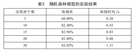 本文在實驗中使用隨機森林模型,為了找到隨機森林包含決策樹的最佳個數(shù),本文依次設置決策樹的個數(shù)為5、10、15、20、30,實驗結果如表3所示。由表3可知,隨著決策樹個數(shù)變多,隨機森林模型的預測準確率逐漸變高,訓練時間也逐漸變長。當隨機森林含有30個決策樹時,模型的預測準確率最高,預測效果最好。因此,本文中的隨機森林模型,含有30個決策樹時表現(xiàn)最優(yōu)。另外,由于隨機森林模型的訓練時間較少,決策樹個數(shù)不同時,隨機森林模型的訓練時間差別較小,因此本文忽略了訓練時間這一因素。