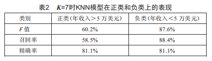 表2是K取值為7時KNN模型在正類和負類上的表現(xiàn),由表2可知模型在負類數(shù)據上的表現(xiàn)要優(yōu)于正類數(shù)據的表現(xiàn),無論是召回率、精確率還是F值,負類數(shù)據的預測值都要更高一些。經過分析得知,這是由于數(shù)據分布不均衡導致的。在數(shù)據集中,負類數(shù)據共有3779條,大約占了整個數(shù)據集的76%,而相比之下,正類數(shù)據只有1221條,占整個數(shù)據集的24%左右。在這種正負類數(shù)據分布不均衡的情況下,模型對于數(shù)量大的數(shù)據集更加敏感,在預測時對數(shù)據較多的類別有更大的傾向性,容易將輸入數(shù)據判別為數(shù)據量更大的數(shù)據類別,正是這一原因造成了表2中正負類表現(xiàn)的差異。