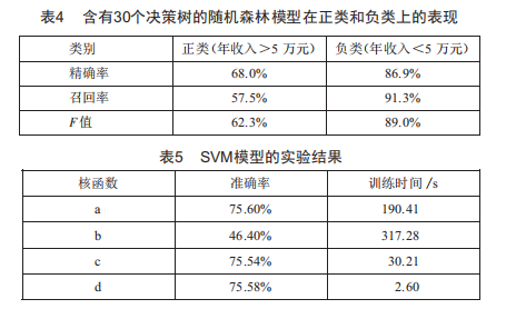 表4是含有30個決策樹的隨機森林模型的實驗結果,由表4不難看出,和KNN類似,不論是精確率、召回率還是F值,隨機森林模型在負類數(shù)據的表現(xiàn)都優(yōu)于正類數(shù)據的表現(xiàn)。這同樣是由于數(shù)據集中數(shù)據分布不均衡的原因導致的,前文已有分析,這里不再贅述。