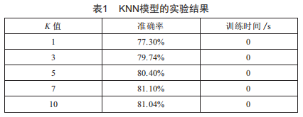 本文首先使用KNN模型進行實驗。實驗過程中首先調整KNN模型中K值的大小,設置K值分別為l、3、5、7、l0,實驗結果表1所示。