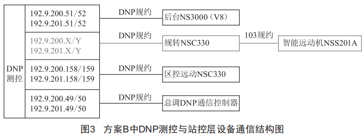 方案B:修改DNP測控配置,增加通道接入規(guī)轉(zhuǎn)NSC330。該方案的DNP測控與站控層設(shè)備通信結(jié)構(gòu)如圖3所示。