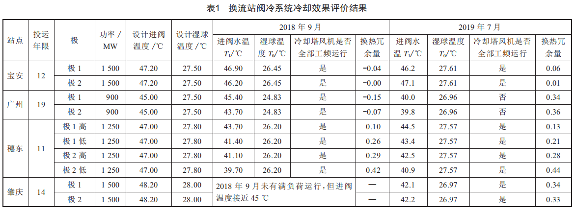 應(yīng)用上述評價公式,對4個投運超過10年的換流站閥冷系統(tǒng)外冷水冷卻效果開展評估,結(jié)果如表1所示。數(shù)據(jù)表明,廣州站在2018年增加一臺冷卻塔之后冷卻效果大幅提升,換熱冗余量從-0.15上升至0.34(且冷卻塔風(fēng)扇還未完全出力):肇慶站在2018年底更換冷卻水管之后換熱冗余量增加至0.34,具備一定冗余度:寶安站2018年及2019年換熱冗余量均在0左右,已無任何冗余度:穗東站各個閥組換熱冗余量差別較大,但2018年及2019年基本持平。