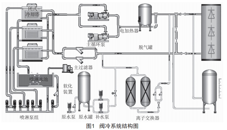 高壓直流運行過程中換流閥會產(chǎn)生大量的熱,主要通過換流閥冷卻系統(tǒng)以水為介質(zhì)對換流閥進(jìn)行冷卻。閥冷卻系統(tǒng)作為換流閥的必要輔助系統(tǒng),通過精確調(diào)控閥冷水的溫度、流量、壓力、水質(zhì)等技術(shù)指標(biāo),達(dá)到節(jié)能環(huán)保、高效冷卻的目的,保證換流閥安全、穩(wěn)定、可靠運行。換流閥冷卻系統(tǒng)主要分為內(nèi)冷水系統(tǒng)和外冷水系統(tǒng)。內(nèi)冷水系統(tǒng)為封閉循環(huán)系統(tǒng),直接與換流閥接觸實現(xiàn)冷卻功能:在換流過程中,換流站設(shè)備中的部分發(fā)熱元件會產(chǎn)生熱量,通過閥冷系統(tǒng)內(nèi)循環(huán)的去離子冷卻水流入各個組件,帶走發(fā)熱元件產(chǎn)生的熱量:外冷水系統(tǒng)為通過冷卻塔對內(nèi)冷水進(jìn)行冷卻,間接實現(xiàn)冷卻功能,然后通過外冷設(shè)備將內(nèi)冷水帶出的熱量發(fā)散到大氣環(huán)境中。典型閥冷系統(tǒng)結(jié)構(gòu)圖如圖1所示。