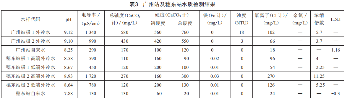 可以看到廣州站與穗東站兩地的自來水水質(zhì)差異較大,廣州站當(dāng)?shù)氐淖詠硭淅矢窭麪栔笖?shù)(L.S.I)為1.16,屬于結(jié)垢型水質(zhì),經(jīng)過濃縮后結(jié)垢趨勢明顯,濃縮倍數(shù)偏高會導(dǎo)致結(jié)垢加劇,因此應(yīng)加大藥劑投加:同時應(yīng)維持外冷水濃縮倍數(shù)在2倍左右,故應(yīng)加大噴淋水池的泄水量。穗東站當(dāng)?shù)刈詠硭甃.S.I=-0.3,補充水屬于輕微腐蝕型水質(zhì),屬于典型低硬度、低堿度水質(zhì),系統(tǒng)經(jīng)濃縮運行后,腐蝕性下降,結(jié)垢趨勢增加。補水水質(zhì)較好,濃縮倍數(shù)適中,極2高端濃縮倍數(shù)遠(yuǎn)超控制值,需加大棄水排污,建議濃縮倍數(shù)保持在3~5倍。系統(tǒng)水質(zhì)較好,除極2高端需加大棄水外,其他閥組按現(xiàn)有方案保持運行。