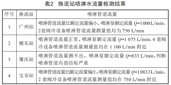 根據(jù)各換流站閥冷系統(tǒng)換熱冗余量下降情況,現(xiàn)場分別對運行中的閥冷系統(tǒng)設(shè)備開展外冷水設(shè)備檢查,內(nèi)容主要包括各換流站閥冷系統(tǒng)噴淋管道流量檢測、閥冷卻塔噴嘴檢查、冷卻塔散熱量分析,通過詳細(xì)梳理各換流站閥冷系統(tǒng)冷卻塔噴淋水流量、噴嘴檢查情況、內(nèi)水冷運行數(shù)據(jù)等分析出各站的外冷冷卻塔運行狀況。