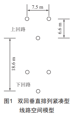 本文研究以500kV垂直排列雙回緊湊型線路為例,導線采用4×JL/G2A-720/50鋼芯鋁絞線,分裂間距500mm,地線采用JLB35-150鋁包鋼絞線,平均土壤電阻率取500Q·m,運行電壓取525kV,正常輸送容量2260MVA(經(jīng)濟電流密度0.9A/mm2),環(huán)境溫度35℃,風速0.5m/s,太陽輻射功率密度1000w/m2。垂直排列雙回緊縮型輸電線路空間模型如圖1所示,兩相導線水平距離為7.5m,上下層導線間距6.5m,呈倒三角布置,回路間層間距離18.6m。