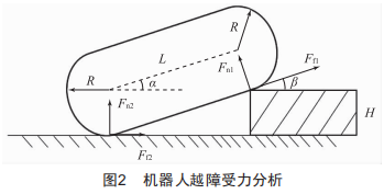 由于化工場所室內(nèi)的設(shè)備、實驗臺眾多,環(huán)境復(fù)雜,機(jī)器人的移動速度不能過快,以免意外撞擊障礙物產(chǎn)生火花點燃可燃性氣體。選取履帶式平臺作為機(jī)器人的移動平臺,其中一個原因是履帶能增加機(jī)器人與地面的接觸面積,加上降低機(jī)器人重心的處理方式,機(jī)器人便基本具有較好的穩(wěn)定性。電機(jī)作為機(jī)器人履帶平臺的驅(qū)動件,其性能也影響著機(jī)器人的平穩(wěn)性,特別是從靜止開始加速以及從運(yùn)動到停止的加減速環(huán)節(jié),扭矩是重要因素之一。下文將通過履帶平臺的越障分析來探討扭矩的設(shè)計,如圖2所示,機(jī)器人翻越障礙物的某一時刻靜止在該位置,受力平衡。