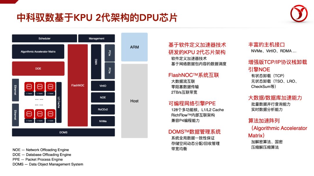 為了實(shí)現(xiàn)這個(gè)功能,我們可以通過(guò)我們研發(fā)的第二代架構(gòu)的DPU產(chǎn)品結(jié)構(gòu)來(lái)體現(xiàn)。在這個(gè)架構(gòu)中,有幾個(gè)比較創(chuàng)新的功能單元,比如NOE,是傳統(tǒng)TOE的升級(jí)版;DOE,是專門用于做數(shù)據(jù)查詢加速,還有DOMS,是一種高效的管理片上緩存數(shù)據(jù)的結(jié)構(gòu)。其它的創(chuàng)新的結(jié)構(gòu)還包括,F(xiàn)lashNOC的片上互聯(lián)技術(shù),還有多種面向特定IO的DMA的單元等等。