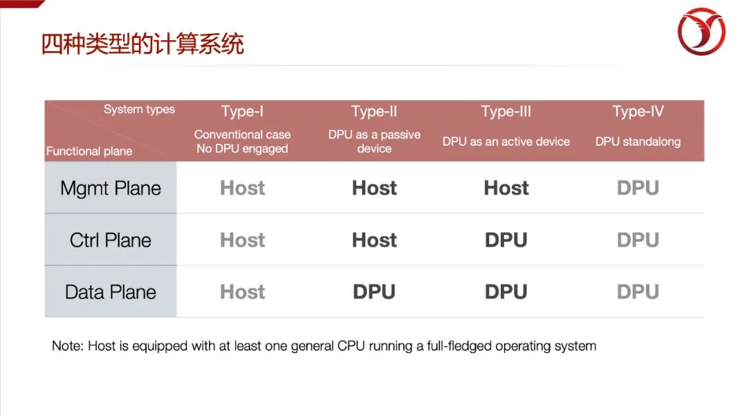 如果我們重新審視一下系統(tǒng)功能的載體分布情況,就會(huì)看到DPU其實(shí)越來(lái)越不像是一個(gè)單純的加速器,而是與CPU全方位配合的一個(gè)關(guān)鍵組件。傳統(tǒng)的經(jīng)典的計(jì)算系統(tǒng),我們稱之為類型I(Type-I)是主機(jī)端負(fù)責(zé)所有的管理、控制、數(shù)據(jù)面的功能;異構(gòu)計(jì)算的發(fā)展最先牽住的“牛鼻子”就是數(shù)據(jù)密集、計(jì)算密集的算法加速,所以主要卸載的就是數(shù)據(jù)面的計(jì)算負(fù)載,但是控制、管理都很少涉及,我們稱之為類型II(Type-II)。一個(gè)典型的表征就是從Host端只能發(fā)現(xiàn)這個(gè)計(jì)算設(shè)備,但是對(duì)于設(shè)備的狀態(tài),啟動(dòng)、關(guān)閉、任務(wù)分配等都比較不方便。隨著智能網(wǎng)卡等形態(tài)的產(chǎn)品出現(xiàn),在設(shè)備端除了數(shù)據(jù)面的優(yōu)勢(shì)得以強(qiáng)化外,出現(xiàn)了完整的控制面功能,我們稱之為類型III(Type- III)。例如ARM的控制器,運(yùn)行了輕量級(jí)的操作系統(tǒng)用于管理板卡上的資源;這也是目前比較常見的類型。還有最后一類,Type-IV,是DPU承擔(dān)所有數(shù)據(jù)面、控制面、管理面的功能,而HOST側(cè)反而不那么重要的,這被認(rèn)為是DPU的終極形態(tài),即完全以DPU為中心來(lái)構(gòu)建計(jì)算系統(tǒng)。前不久阿里云公布的CIPU(Could Infrastrucutre Procesing Unit)宣稱替代CPU成為新一代云計(jì)算核心硬件,可以說(shuō)是把DPU推向了舞臺(tái)的中心,雖然也有很多爭(zhēng)議,但這也許正是DPU發(fā)展的方向。