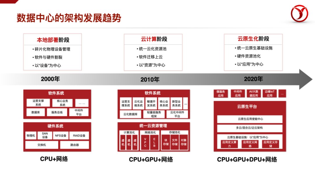 最后,如果說(shuō)DPU發(fā)展最大的驅(qū)動(dòng)力,其實(shí)還是來(lái)自需求側(cè)。數(shù)據(jù)中心的架構(gòu)發(fā)展趨勢(shì)已經(jīng)從20年前的本地部署集群,到十年前的云化資源,再到目前的云原生階段?;A(chǔ)設(shè)施層變得越來(lái)越厚重,向下越來(lái)越強(qiáng)化硬件資源的池化,向上是“XaaS”,即“一切皆可服務(wù)化”。K8S等系統(tǒng)成為了新的“操作系統(tǒng)”,服務(wù)網(wǎng)格成為了新的網(wǎng)絡(luò)化應(yīng)用開發(fā)基礎(chǔ),DevOps開發(fā)運(yùn)維一體化……在“生產(chǎn)率”得到提升的同時(shí),也直接催生了算力的需求,特別是IaaS和PaaS層的算力需求——這也是DPU的主戰(zhàn)場(chǎng)。