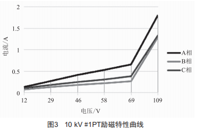 翻查該10kV#1PT出廠試驗報告,做了出線端子標志檢驗、絕緣電阻、直流電阻、二次繞組耐壓、一次繞組耐壓、感應耐壓、局放、誤差、勵磁特性等9項試驗。其中,勵磁特性試驗顯示該PT相間偏差較大,數(shù)據(jù)如表1所示,繪制的勵磁特性曲線如圖3所示。