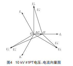 10kV#1PT、10kV#2PT為同一電源,從10kV#2M母線電壓三相平衡可以判斷系統(tǒng)電壓正常,同時可以肯定10kV#1PT輸出電壓有問題,而且三相電壓不平衡,線電壓正常,屬于中性點電壓偏移的現(xiàn)象。
