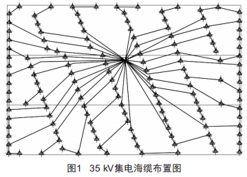近海深水區(qū)域900Mw大型海上風(fēng)電項目的35kV集電海纜布置如圖1所示。