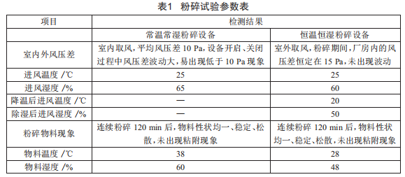 效果測試:取中藥材太子參物料l000kg,進(jìn)入粉碎機(jī)試機(jī),對比采用常溫常濕粉碎設(shè)備和恒溫恒濕粉碎設(shè)備處理,檢測粉碎時(shí)室內(nèi)外風(fēng)壓差、進(jìn)風(fēng)溫濕度及通用粉碎機(jī)物料的溫濕度,結(jié)果如表l所示。