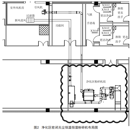 凈化區(qū)密閉無塵恒溫恒濕粉碎機(jī)布局圖如圖2所示。