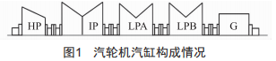 本廠采用哈爾濱汽輪機(jī)廠有限責(zé)任公司和東芝聯(lián)合設(shè)計(jì)制造的超超臨界參數(shù)、一次中間再熱、凝汽式、單軸、四缸四排汽、雙背壓、八級(jí)回?zé)岢槠狡啓C(jī)。如圖1所示,汽輪機(jī)本體通流部分由四部分組成:1個(gè)單流高壓缸、1個(gè)雙流中壓缸和2個(gè)雙流低壓缸(A/B)。4個(gè)缸均為雙層缸(內(nèi)缸和外缸),水平中分面結(jié)構(gòu)。汽輪機(jī)主軸分為4段,以剛性聯(lián)軸器一一相連,形成整體的通流轉(zhuǎn)子。