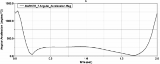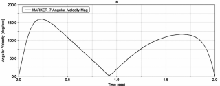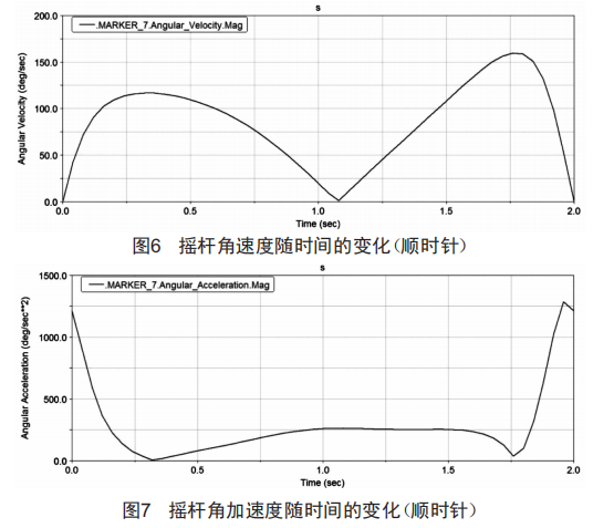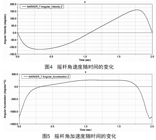 下面借助ADAMS軟件分析曲柄轉(zhuǎn)動一周時,搖桿角速度和角加速度的變化趨勢。為方便運算,假設(shè)曲柄順時針旋轉(zhuǎn),且轉(zhuǎn)速為30s/min,初始位置為倒伏狀態(tài)。搖桿角速度和角加速度隨時間的變化分別如圖4、圖5所示。