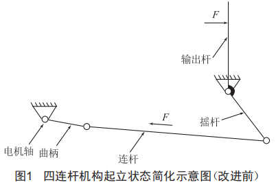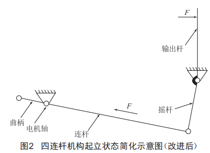 通過改進四連桿機構(gòu),利用其"死點"位置,使輸出桿在受到外力作用下晃動角度控制在±19,有效解決了輸出桿在起立位置受載條件下的晃動問題。利用四連桿的"急回"特性,延長起立時間,減小起立位置瞬間輸出桿的慣性力,可有效減緩起立瞬時沖量,提升起立瞬間的穩(wěn)定性。