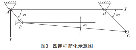 將改進后的四連桿機構(gòu)進行簡化,如圖3所示:AB為曲柄,BC為連桿,CD為搖桿,AD為機架。