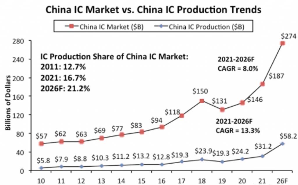 圖 | 中國(guó) IC 市場(chǎng)和中國(guó) IC 自產(chǎn)情況對(duì)比,圖源:IC Insights