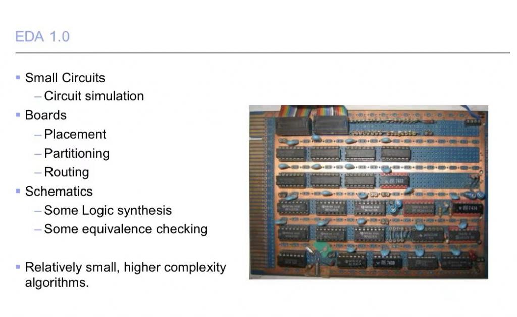 據(jù)悉,這些早期的點(diǎn)工具已經(jīng)可以基于標(biāo)準(zhǔn)格式的數(shù)據(jù)交換,通過(guò)組合,對(duì)硬件抽象語(yǔ)言進(jìn)行自動(dòng)處理,直到產(chǎn)生可制造的物理設(shè)計(jì),包括功能的仿真驗(yàn)證、有限的邏輯綜合以及電路和電路板的布線等。雖然在算法上往往相對(duì)簡(jiǎn)單,處理的電路相對(duì)較小,工具彼此之間幾乎完全離散,但是仍然可以通過(guò)聚焦痛點(diǎn)來(lái)有效地解決局部問(wèn)題;而且得益于當(dāng)時(shí)硬件設(shè)計(jì)制造流程的相對(duì)簡(jiǎn)單,這些點(diǎn)工具的局部?jī)?yōu)化往往和整體優(yōu)化不相關(guān)或者不產(chǎn)生矛盾,從而有效推動(dòng)了半導(dǎo)體設(shè)計(jì)制造的快速發(fā)展,這一階段被稱為 EDA 1.0 時(shí)期。