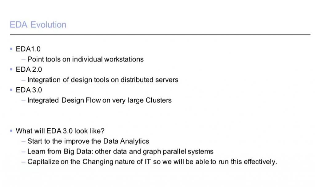 伴隨著 EDA 核心技術(shù)的進(jìn)步,在初步成形的 EDA 全流程平臺(tái)上,業(yè)界開(kāi)始嘗試各個(gè)方向的商業(yè)性探索。比如 2014~2015 年左右,大數(shù)據(jù)和云計(jì)算潮流處于風(fēng)頭浪尖的時(shí)候,業(yè)界開(kāi)始有人基于對(duì) EDA 流程中計(jì)算力需求和數(shù)據(jù)流瓶頸的分析,在一些正式場(chǎng)合曾提出所謂的 EDA3.0 EDAaaS:開(kāi)放工具和技術(shù)平臺(tái),用面向大數(shù)據(jù)和云計(jì)算的模式來(lái)開(kāi)展設(shè)計(jì)服務(wù)的轉(zhuǎn)型。這個(gè)探索側(cè)重于對(duì)現(xiàn)有 EDA 用戶的硬件設(shè)計(jì)過(guò)程中的計(jì)算需求做優(yōu)化,對(duì)用戶已經(jīng)積累的海量設(shè)計(jì)數(shù)據(jù)進(jìn)行再處理,提取并重組有效信息以簡(jiǎn)化和縮減產(chǎn)品設(shè)計(jì)周期,甚至試圖實(shí)現(xiàn)產(chǎn)品本身的優(yōu)化和差異化等。