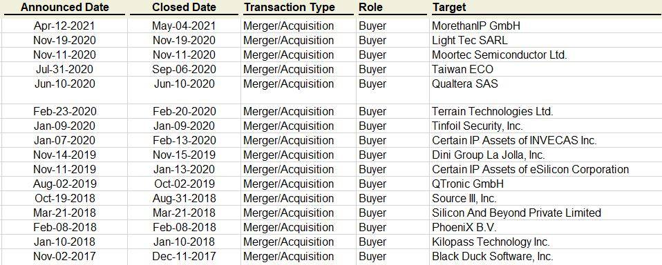根據(jù)資料顯示,Synopsys 從 1994 年 5 月第一筆收購(gòu) Logic Modeling Corporation 起,到最近的 2021 年 4 月收購(gòu) MorethanIP GmbH 為止,共完成 112 起收并購(gòu)案例;Cadence 從 1989 年 9 月第一筆收購(gòu) Gateway Design Automation 起,到最近的 2021 年 4 月收購(gòu) Pointwise 為止,共完成 79 起收并購(gòu)案例;而 Mentor Graphics 從 1990 年 1 月第一筆收購(gòu) Silicon Compiler Systems 起,到獨(dú)立運(yùn)營(yíng)的 2018 年 6 月收購(gòu) Austemper Design Sys 為止,共完成 56 起收并購(gòu)案例,被收編進(jìn) Siemens EDA 后又完成了從 TASS International 到 OneSpin 標(biāo)的的 14 起 EDA 相關(guān)的收并購(gòu)案例。再加上 2021 年 4 月以來(lái)的幾筆并購(gòu),這意味著在過(guò)去的 33 年中,三家 EDA 巨頭企業(yè)共完成了約 270 起收并購(gòu)案。