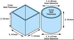 圖6顯示空心矩形和圓柱形不銹鋼擠壓件,壁厚2mm,高40mm。圓柱形的外徑為43mm,矩形模型的x和y軸的尺寸也均為43mm。