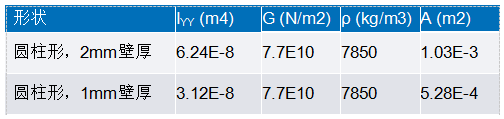 表6.高度為40mm、壁厚分別為1mm和2mm的圓柱形的面積慣性矩(IYY)、剪切模量(G)、密度(ρ)和橫截面積(A)