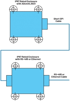 ADI建議使用圖23所示的分布式系統(tǒng),而不是嘗試將所有組件集成到一個矩形外殼中。根據(jù)此概念,ADcmXL3021被封裝到一個IP67等級的外殼中,SPI數(shù)據(jù)在短距離(不到10cm)內(nèi)路由到一個單獨的IP67等級的外殼中,該外殼中集成了電纜接口PCB、以太網(wǎng)或RS-485收發(fā)器,以及相關的電源IC和其他電路。