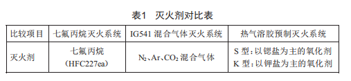 各氣體滅火系統(tǒng)的滅火劑對(duì)比如表1所示。