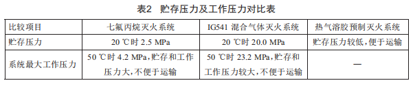 各氣體滅火系統(tǒng)的貯存壓力及工作壓力對(duì)比如表2所示。
