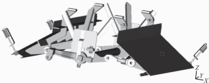 30t軸重煤炭漏斗車(chē)是中車(chē)長(zhǎng)江車(chē)輛有限公司為澳大利亞某公司研制的運(yùn)煤專用漏斗車(chē)。每輛車(chē)均有t套底門(mén)及開(kāi)閉機(jī)構(gòu),它們的開(kāi)閉功能互相獨(dú)立,都是依靠觸碰安裝在軌道兩側(cè)的開(kāi)關(guān)門(mén)檔完成底門(mén)的開(kāi)閉動(dòng)作。當(dāng)車(chē)輛低速運(yùn)行時(shí),車(chē)輛一側(cè)開(kāi)門(mén)滾輪觸碰地面開(kāi)門(mén)檔,卸貨門(mén)軸順時(shí)針轉(zhuǎn)動(dòng),沖破機(jī)構(gòu)死點(diǎn),底門(mén)在自重和貨物重力下打開(kāi),完成卸貨。關(guān)門(mén)時(shí),車(chē)輛繼續(xù)運(yùn)行,車(chē)輛另一側(cè)關(guān)門(mén)滾輪觸碰地面軌道系統(tǒng)的關(guān)門(mén)檔,卸貨門(mén)逆時(shí)針轉(zhuǎn)動(dòng),越過(guò)機(jī)構(gòu)死點(diǎn),在限位檔與預(yù)緊彈簧共同作用下,完成關(guān)門(mén)。
