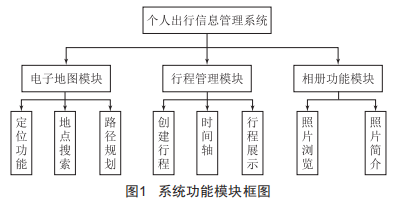 本文研究的產(chǎn)品主要實(shí)現(xiàn)以下幾個功能模塊:定位功能模塊、地點(diǎn)搜索功能模塊、路徑規(guī)劃功能模塊、拍照功能模塊、行程管理功能模塊、時(shí)間軸功能模塊、相冊功能模塊(圖1) 。