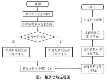 (1)行程管理功能模塊:本研究的主題便是對用戶的出行信息進(jìn)行管理 ,用戶可自行設(shè)定行程主題及時(shí)間 , 點(diǎn)擊開始行程后即可通過拍照記錄行程狀態(tài)以及位置信息 ,所拍照片會自動存儲到所對應(yīng)行程主題文件夾下 ,并在相冊中對應(yīng)顯示相關(guān)信息。用戶也可以在未創(chuàng)建行程的情況下使用拍照功能 ,此時(shí)會將照片默認(rèn)存儲于以當(dāng)天日期為名創(chuàng)建的文件夾下 ,同時(shí)也會自動記錄位置信息 ,相冊中顯示的照片信息即為無主題。