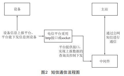 由于本系統(tǒng)不接入公網(wǎng),因此采用短信作為設(shè)備和主站平臺(tái)之間通信的方式。設(shè)備通過(guò)短信,使用移動(dòng)平臺(tái)接口進(jìn)行數(shù)據(jù)收發(fā)。主站系統(tǒng)通過(guò)短信貓,經(jīng)中轉(zhuǎn)程序,同移動(dòng)平臺(tái)進(jìn)行通信,實(shí)現(xiàn)設(shè)備同主站之間的通信。