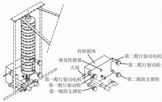 爬行驅(qū)動機構(gòu)包括爬行驅(qū)動電機、爬行驅(qū)動輪、輔助支撐輪、裝置主體安裝板以及控制箱體。爬行驅(qū)動電機與爬行驅(qū)動輪連接后固定在裝置主體安裝板上,輔助支撐輪通過支撐輪軸同樣連接在裝置主體安裝板上:裝置作業(yè)時爬行驅(qū)動輪與輔助支撐輪同時支撐在固定安裝支架的絕緣桿上:控制箱體內(nèi)安裝電子控制元件及無線傳輸系統(tǒng),控制箱外安裝有視覺傳感器及天線。