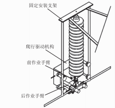 第二步,安裝其余作業(yè)裝置到固定安裝支架上。將前作業(yè)手臂和后作業(yè)手臂安裝在爬行驅(qū)動機構(gòu)上,然后吊裝上塔:吊裝上塔之后將第一爬行驅(qū)動輪、第二爬行驅(qū)動輪、第一輔助支撐輪及第二輔助支撐輪等四個爬行輪安裝在第一絕緣桿和第二絕緣桿之間。